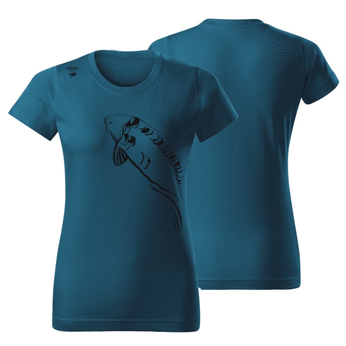 Kvalitní dámské tričko v petrolejové barvě s naším originálním designem vyplouvajícího kapra v přední části.