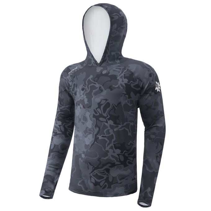 UV tričko s dlouhým rukávem a kapucí, které má ochranný filtr UPF50+ a poskytuje maximální ochranu proti škodlivým slunečním paprskům, takže se můžete soustředit na rybolov bez obav z přehřátí nebo spálení.