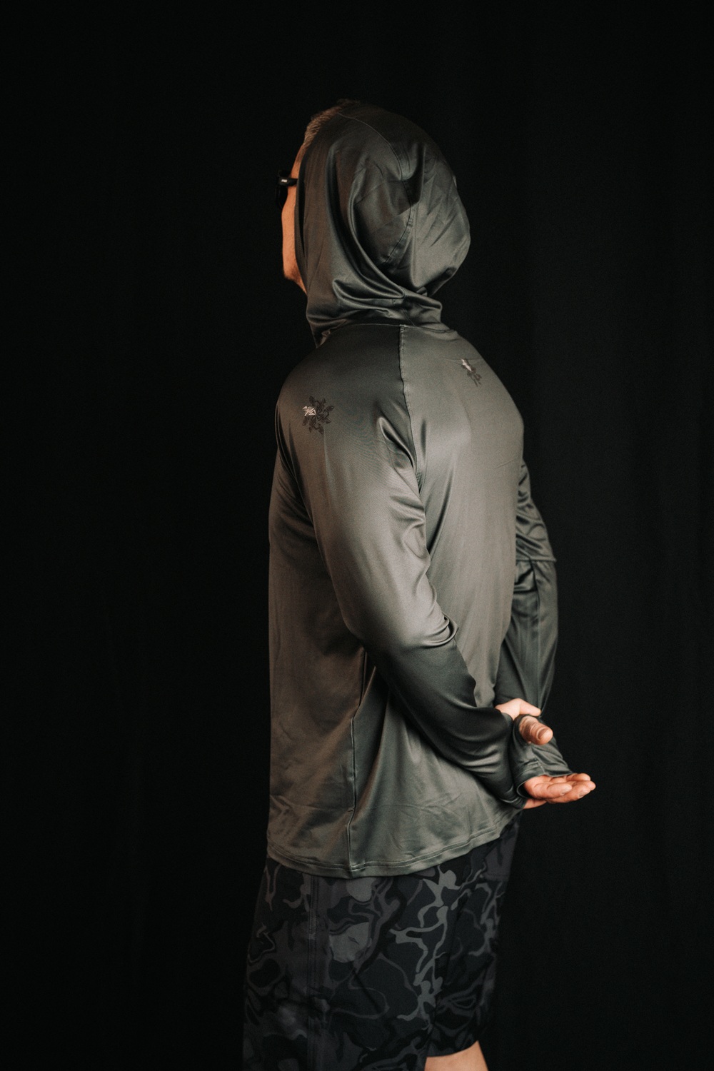 UV tričko s dlouhým rukávem a kapucí, které má ochranný filtr UPF50+ a poskytuje maximální ochranu proti škodlivým slunečním paprskům, takže se můžete soustředit na rybolov bez obav z přehřátí nebo spálení.