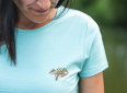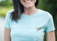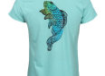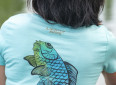 Kvalitní dámské tričko v zelené pastelové barvě s designem koi kapra na zádech.