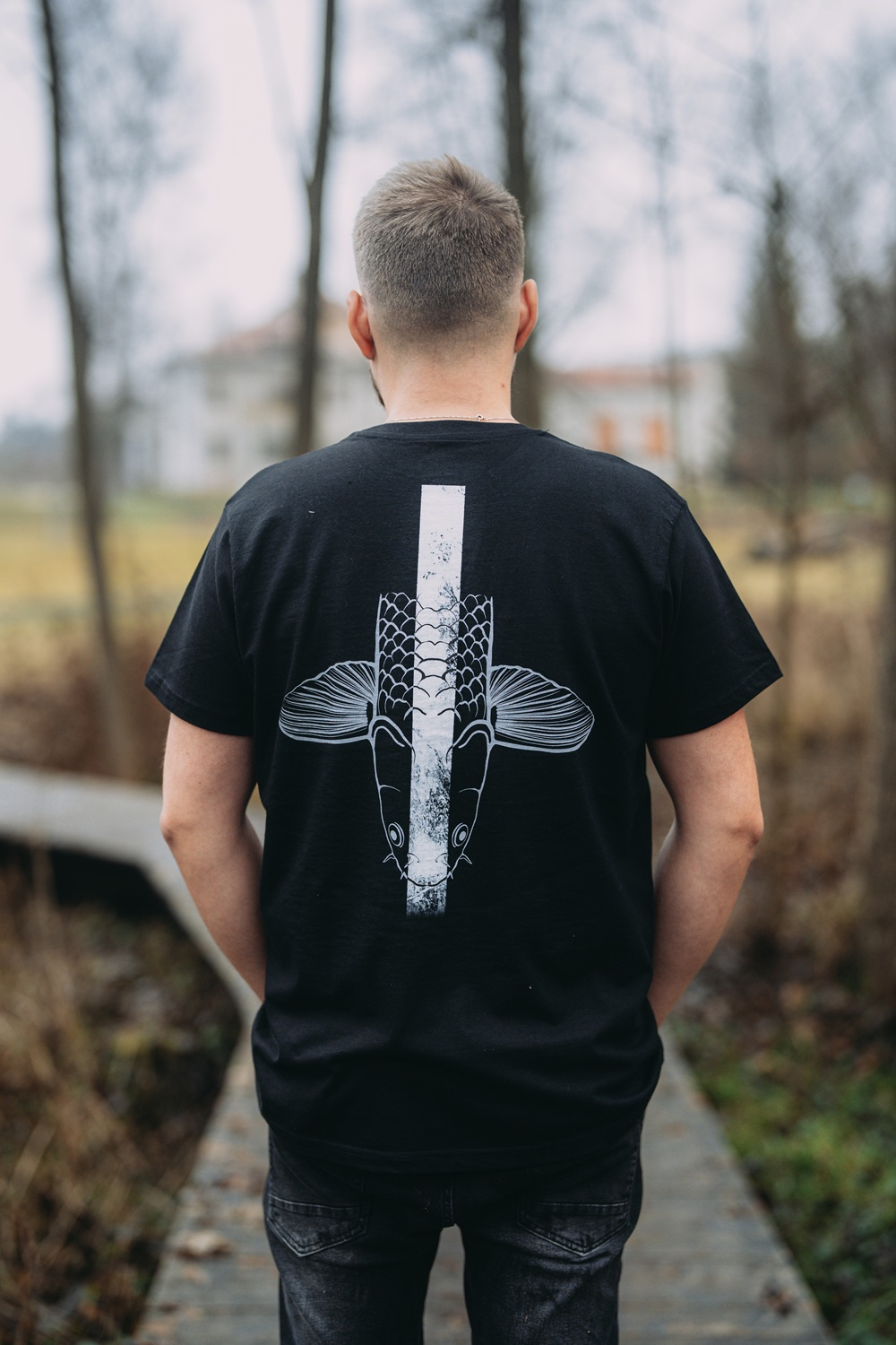Kvalitní pánské tričko v černé barvě s naším originálním designem kapří hlavy na zádech.