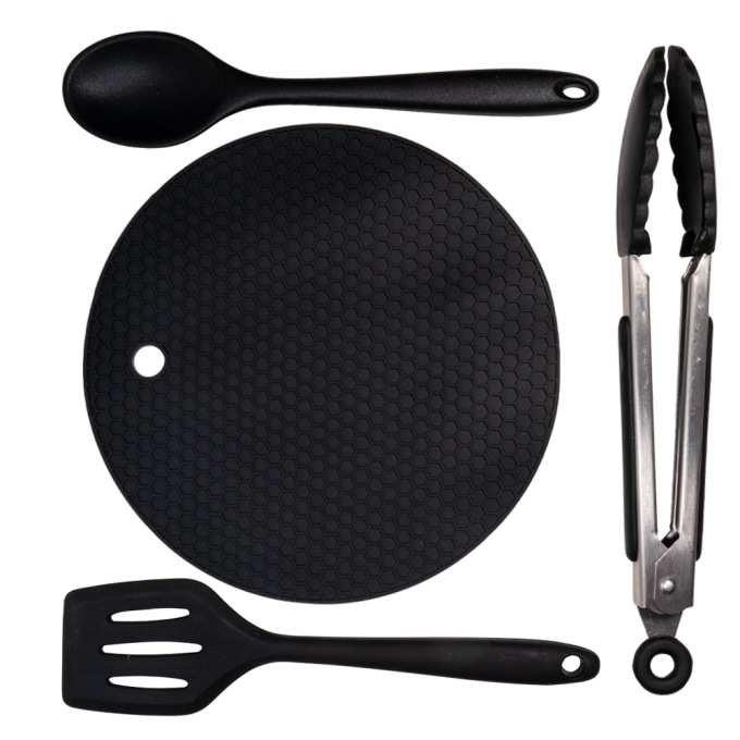 A készlet tartalmaz egy tároló alátétet, grillcsipeszt, lapátot és kanalat.